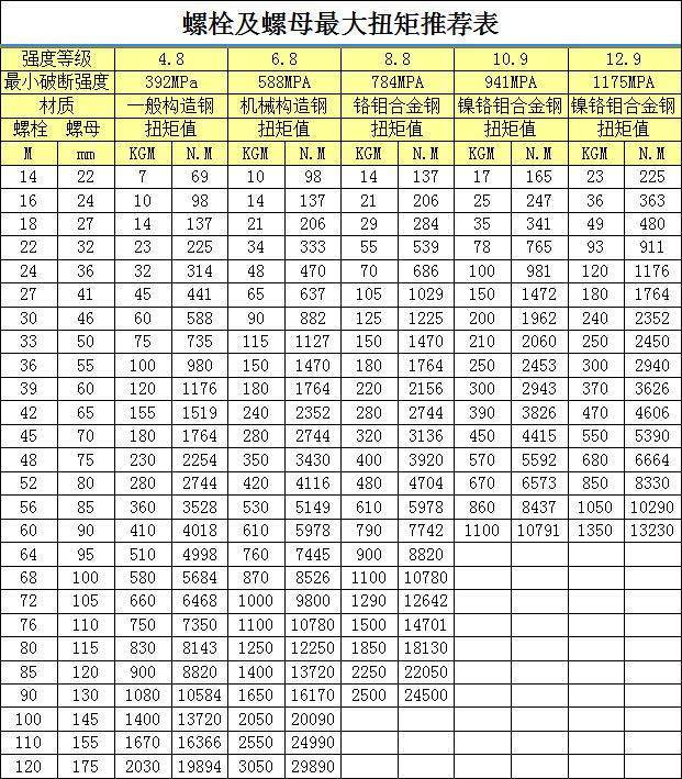 力矩?fù)Q算其實(shí)就是螺栓螺母扭矩值推薦表,通過(guò)這張表我們能夠查詢出螺栓螺母強(qiáng)度等級(jí)、材質(zhì)和螺栓大小扭矩值,通過(guò)這些數(shù)據(jù)我們也能更好的選型,知道自己的工況適合哪一種液壓扳手。其實(shí)如果你看不懂這張表,不知道中空式扳手力矩值換算怎么弄,也沒(méi)關(guān)系,畢竟現(xiàn)在很多液壓扳手品牌商家都會(huì)為你進(jìn)行售前選型。