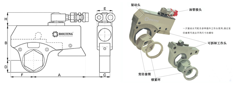 石油防噴器采油樹專用缺口式超薄中空液壓扭矩/扭力/力矩扳手,緊固或拆卸過程中,無需反復(fù)取下,一次安裝即可。